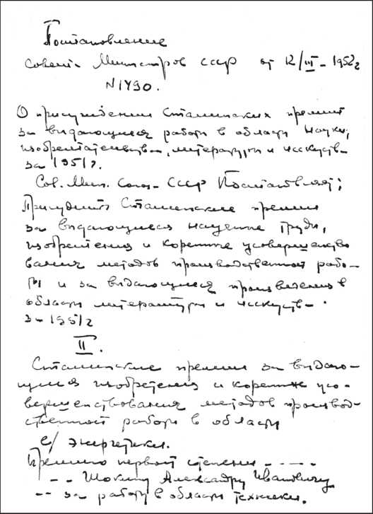 Постановление Совета Министров СССР от 12.03.52 № 1490 «О присуждении Сталинских премий за выдающиеся работы в области науки, изобретательства, литературы и искусства за 1951 год»
