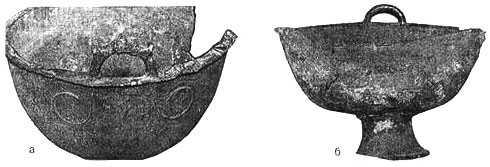 Рис. 1.30. Скифские бронзовые котлы (коллекция ГМИИ): а – с фигурной ручкой и «шнуровым» орнаментом; б – с простой дугообразной ручкой.