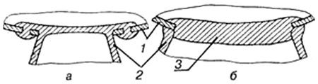В одном из вариантов видно, что ручка и корпус котла изготавливались не одновременно – вероятно, в литейную форму котла закладывали предварительно отлитые ручки. На рис. 1.31 показаны типы соединения методом литья корпуса и ножки котла. В первом примере (рис. 1.31, а) на готовый корпус (1) заливали ножку (2). Во втором (рис. 1.31, б) – отдельно отливали корпус (1) и ножку котла (2), а затем соединяли их наплавкой (3). Анализируя технологический процесс изготовления цельнолитых котлов (были и такие), специалисты пришли к выводу, что при выполнении части литейной формы, обрамляющей внутреннюю поверхность, мастера применяли шаблон с вертикальной осью вращения [94]. Этот прием впоследствии широко использовали для литья крупных колоколов.