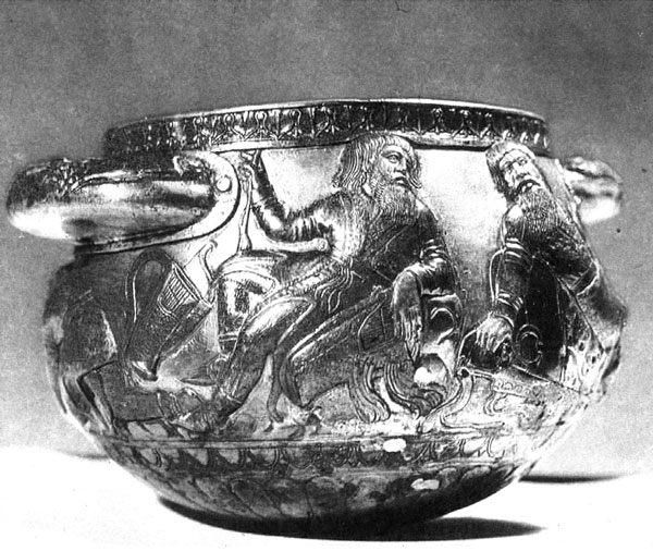 Рис. 1.32. Чаша с изображением пирующих скифов. Серебро с позолотой, литье, выколотка, чеканка, гравировка. Ручки отдельно отлиты и приклепаны. Найденная в кургане «Гайманова могила», Украина, Запорожская обл. Вторая половина IV в. до н. э. Украина, Киев, Музей исторических ценностей.