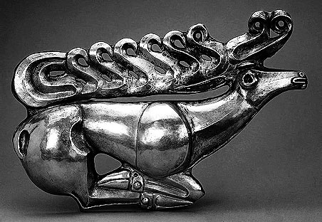 Рис. 1.34. Нащитная бляха в виде фигуры оленя. Золото; литье, чеканка. Найдены в России, Костромском кургане 1, Закубанье, станица Костромская. Около 600 г. до н. э. Эрмитаж.