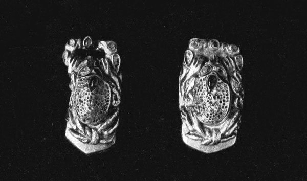 Рис. 1.35. Украшавшие одежду бляшки сарматских царей. Золото, литье, вставки из бирюзы. Найдены в богатом погребении, летом 1984 года в Астраханской области. Рубеж н. э.?. [95]