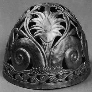 Рис. 1.37. Шлем из кургана Ак-Бурун. Золото, ажурное литье. IV в. до н. э. Высота 14,4 см. Найден недалеко от г. Керчь в захоронении скифского, сарматского или миотского вождя. Эрмитаж.