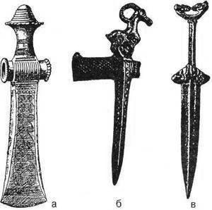 Рис. 2.3. Древнее литое оружие из бронзы [5]: а – боевой топор-молот, длина 21,2 см. Бронзовый век. Скандинавия; б – кельт-алебарда, длина 13 см. Минусинск (Россия), 700-1000 гг. до н. э. Санкт-Петербург, Русский музей; в – кинжал, длина 24 см. Минусинск (Россия), ок. 100 г. до н. э. Санкт-Петербург, Русский музей
