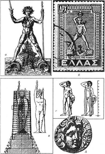 Рис. 2.4. Варианты реконструкции статуи Гелиоса, о. Родос, Греция [29]: а – по А. Тевету (1534 г.); б – греческая почтовая марка (1947–1951 гг.); в – по А. Габриелю (1932 г.); г – по Мэриону (1956 г., 1984 г. – по А. Домашнему); д – голова Гелиоса на серебряной монете Родоса времен Колосса
