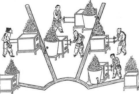 Рис. 2.6. Схема заливки металла из нескольких печей в форму (из старинной китайской книги) [5, 49]