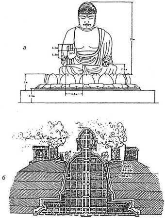 Рис. 2.7. Великий Будда из Нары. Япония. [5, 64]: а – эскиз статуи; б – элементы технологического процесса отливки статуи.