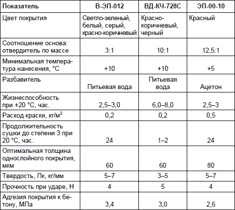 Водно-дисперсионные эпоксидные краски «В-ЭП-012» (ТУ 2316083-05034239-95) представляют собой двухкомпонентные составы: основу и отвердитель. Основой служит эпоксидно-каучуковая пигментированная композиция белого, светло-серого, черного и других цветов. В качестве отвердителя-эмульгатора применяют полиаминоимидазолиновую смолу. Перед применением основу смешивают с 50 %-м водным раствором отвердителя, а затем смесь разбавляют питьевой водой до рабочей вязкости. Допустимый максимальный процент разведения водой – 100 %. При этом вязкость краски не превышает 100–120 секунд по вискозиметру ВЗ-1. Нанесение краски на подложку выполняется кистью, валиком, пневматическим или безвоздушным краскопультом при температуре выше +10 °C и с интервалом перекрывания не менее 4 часов (для полов не менее 24 часов). В агрессивных средах (растворах щелочей, солей, аммиака в воде, автомобильном, техническом масле, бензине) по физико-механическим и защитным свойствам покрытие краской «В-ЭП-012» эквивалентно покрытиям на основе эпоксидных грунтошпаклевок «ЭП-0010» (ЭП-0020) и краски «ЭП-140». Кроме экологических преимуществ, связанных с отсутствием в составе «В-ЭП-012» органических растворителей, еще одним достоинством этой краски по сравнению с органорастворимыми материалами является возможность нанесения ее на влажные бетонные поверхности. Однако в условиях постоянного притока влаги, включая и капиллярный подсос, адгезия «В-ЭП» к подложке резко снижается.