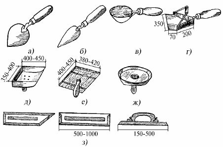 Рис. 1. Инструменты для нанесения и разравнивания раствора: а) штукатурная лопатка; б) отрезовка; в) ковш; г) совок с качающейся ручкой; д) совок-ковш; е) прямоугольный сокол; ж) тарельчатый сокол; з) полутерки