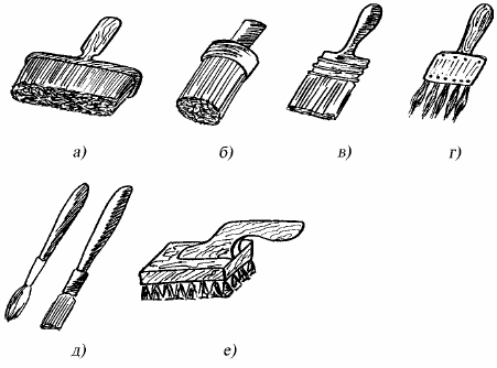 Рис. 4. Кисти: а) макловица; б) маховая кисть; в) флейц; г) шеперка; д) кисти для окрашивания радиаторов; е) торцовка