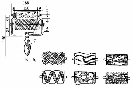 Рис. 5. Накатное устройство с набором валиков: а) общий вид накатного устройства: 1 – накатный валик; 2, б – зажимные барашки, 3 – питающий валик; 4 – ось; 5 – разъемная скоба; 7 – ручка; б) виды накатных валиков