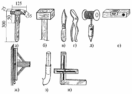 Рис. 6. Инструменты для штукатурных работ: а) штукатурный молоток; б) кулачок; в) штукатурный нож; г) ножницы для резки металла; д) отвес; е) уровень; ж) ватерпас; з) водяной уровень; и) угольник с передвижной планкой