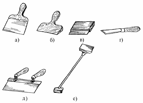 Рис. 7. Шпатели: а) стальной шпатель; б) деревянный шпатель; в) резиновый шпатель; г) штукатурный нож; д) комбинированный шпатель; е) шпатель для потолков