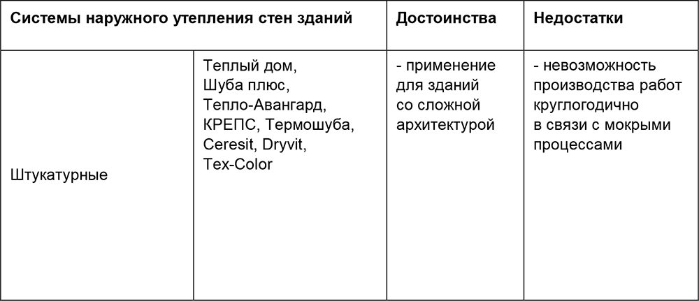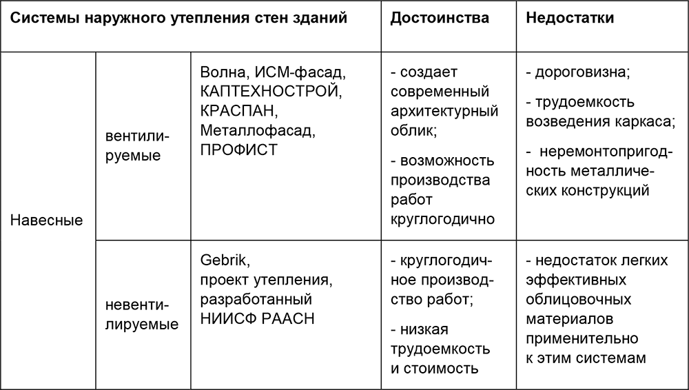 Таблица 1.3. Анализ существующих систем утепления зданий