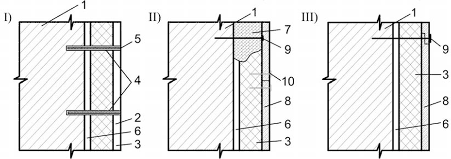Рис. 1.9. Три варианта конструкций утепления наружных стен крупнопанельных зданий: 1 – существующая стена; 2 – базальтофибробетонная стяжка; 3 – утеплитель; 4 – шпонки из базальтофибробетона; 5 – анкер из полимерной арматуры; 6 – клеевой слой; 7 – деревянная рейка; 8 – волокнисто-цементные плиты; 9 – металлический анкер; 10 – шуруп-саморез