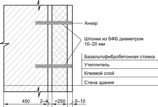 Рис. 1.10. Конструктивная схема утепления наружных стен жилых панельных зданий жесткими пенополистиролбетонными плитами с базальтофибробетонной облицовкой