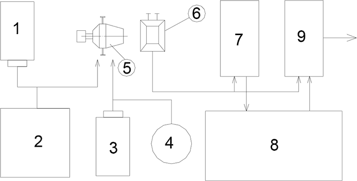 Рис. 1.11. Технологическая схема нанесения на пенополистиролбетонные плиты базальтофибробетонной стяжки в полигонных условиях: 1 – бункер для хранения цемента; 2 – склад песка; 3 – бункер для хранения тонкодисперсного базальтового волокна; 4 – бак для воды; 5 – растворосмеситель; 6 – емкость для раствора; 7 – стенд для нанесения, выравнивания базальтофибробетонной стяжки и затирки поверхности; 8 – склад готовой продукции; 9 – стенд для нанесения клея-раствора из базальтофибробетона