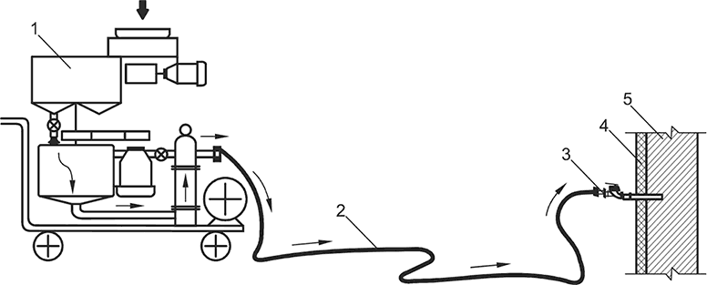 Рис. 1.13. Схема инъецирования отверстий при анкеровке плит к наружным стенам (стрелками указано направление движения раствора): 1 – инъекционный агрегат; 2 – шланг; 3 – инъектор; 4 – пенополистиролбетонные плиты; 5 – наружная стена