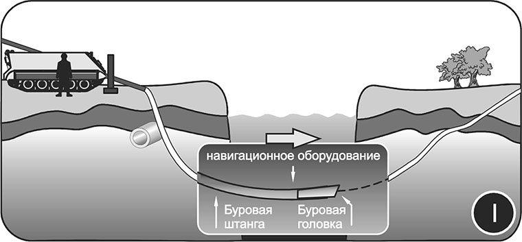 Горизонтально направленное бурение (рис. 2.6) осуществляется с помощью породоразрушающего инструмента – буровой головки со скосом в передней части со встроенным излучателем. Контроль за местоположением буровой головки производится с помощью приемного устройства локатора, который принимает и обрабатывает сигналы встроенного в корпус буровой головки передатчика. На мониторе локатора отображается визуальная информация о местоположении, уклоне, азимуте буровой головки. Также эта информация отображается на дисплее оператора буровой головки. Эти данные являются определяющими для контроля соответствия траектории строящегося трубопровода проектной и минимизируют риски излома рабочей нити.