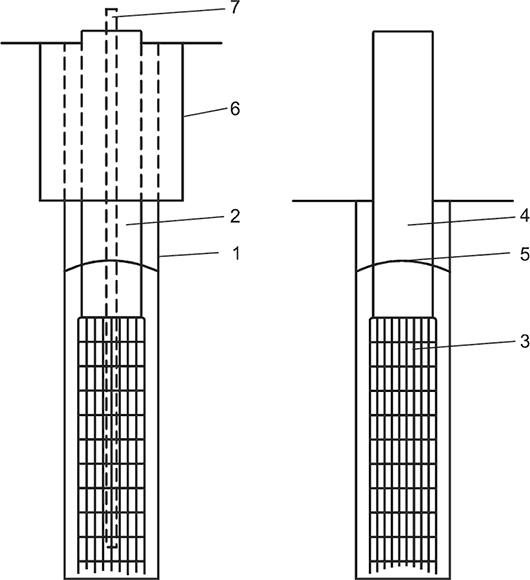 Рис. 3.5. Пример выполнения опоры, где указаны скважина 1, трубно-арматурный каркас 2 с арматурной частью 3 и трубной частью 4, ограничитель 5 уровня заполнения скважины бетонной смесью, кондуктор 6, бетонолитная труба 7