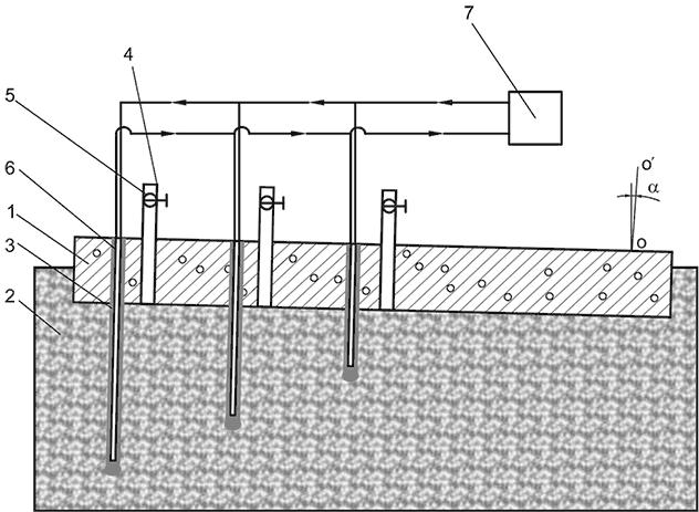 Рис. 4.2. Способ выравнивания сооружений: 1 – фундамент; 2 – грунт; 3 – скважина; 4 – выпускные скважины; 5 – вентиль; 6 – охлаждающий элемент; 7 – компрессор