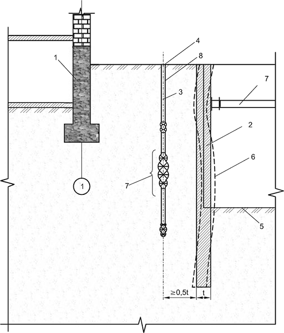 7 – элемент крепления конструкции ограждения котлована (показана распорка, но может быть грунтовый анкер, подкос и т. п.);