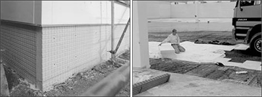 Во избежание деформации фундамента при сезонном промерзании грунта предусматривают устройство теплоизоляции из пенополистирольных плит для уменьшения глубины промерзания грунта под подошвой фундамента. В отапливаемых зданиях теплоизоляцию размещают вертикально по внешней поверхности фундамента и цокольной части стены на высоту не менее 1 м от подошвы фундамента (рис. 4.9).