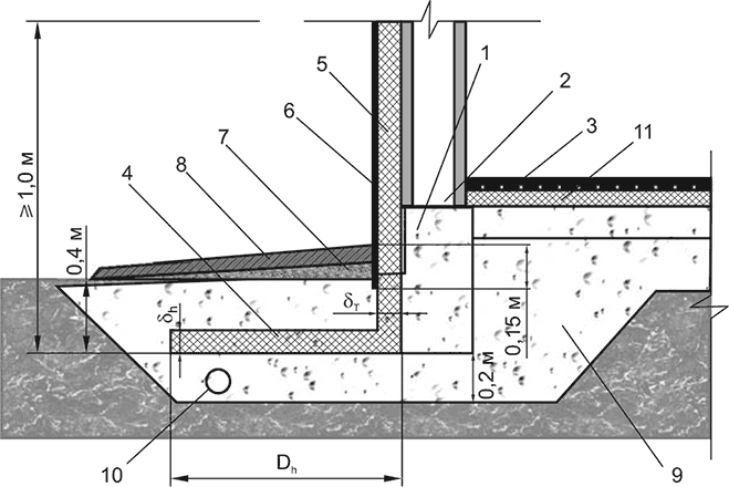 Рис. 4.9. Схема укладки и параметры теплоизоляции в фундаментах отапливаемых зданий с теплоизоляцией пола: 1 – фундамент; 2 – стена здания; 3 – пол здания; 4 – горизонтальная теплоизоляция (KNAUF Therm® Floor / KNAUF Therm® 5 в 1 F); 5 – вертикальная теплоизоляция (KNAUF Therm® Floor / KNAUF Therm® 5 в 1 F); 6 – защитное покрытие; 7 – песчаная подготовка под отмостку; 8 – асфальтовая или бетонная отмостка; 9 – непучинистый грунт; 10 – дренаж; 11 – теплоизоляция пола