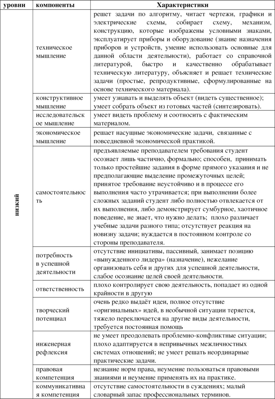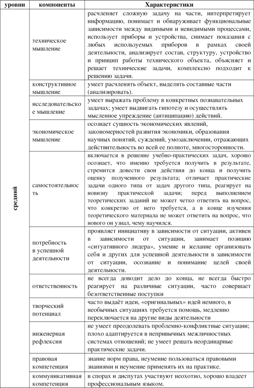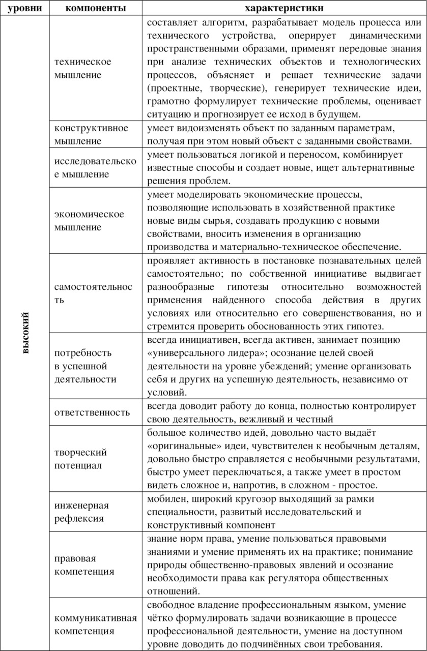 Нам удалось выделить на основе различных исследований компоненты инженерного мышления, необходимых для становления компетентного специалиста в области инженерной деятельности: техническое мышление (умение анализировать состав, структуру, устройство и принцип работы технических объектов в измененных условиях); конструктивное мышление (построение определенной модели решения поставленной проблемы или задачи, под которой понимается умение сочетать теорию с практикой); исследовательское мышление (определение новизны в задаче, умение сопоставить с известными классами задач, умение аргументировать свои действия, полученные результаты и делать выводы); экономическое мышление (рефлексия качества процесса и результата деятельности с позиций требований рынка); самостоятельность и оперативность в выборе стратегий деятельности; потребность в успешной деятельности и в признании достижений со стороны специалиста; ответственность за конечный продукт своей деятельности; творческий потенциал, способствующий выполнению комплекса исследовательских действий в проблемной ситуации; инженерная рефлексия (основа для саморегуляции эмоционального состояния в условиях нервно-психического напряжения); правовая компетенция.