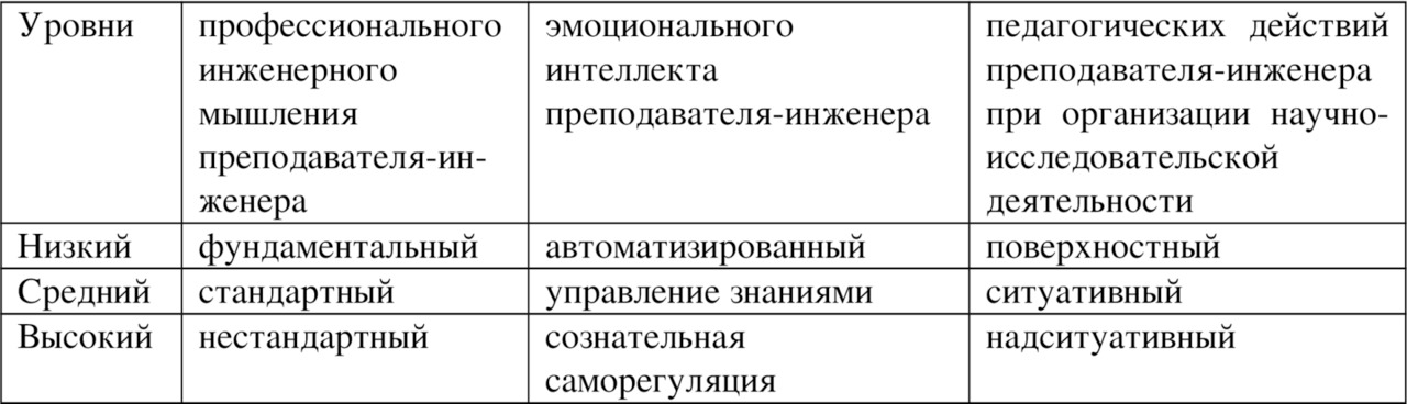 Обратим внимание, что выделенные уровни профессионального инженерного мышления преподавателя-инженера, уровни педагогических действий преподавателя-инженера при организации научно-исследовательской деятельности и уровни эмоционального интеллекта преподавателя-инженера могут быть различные. То есть, если уровень профессионального инженерного мышления преподавателя-инженера высокий, уровень эмоционального интеллекта может быть низким, уровень педагогических действий преподавателя-инженера при организации научно-исследовательской деятельности может быть средним. Всё это может зависеть как внешних факторов, так и внутреннего настроя.