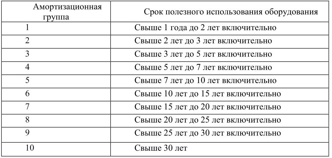 Сроки службы оборудования – это календарная продолжительность (годы и месяцы) периода, в течение которого использование оборудования считается полезным. Сроки полезного использования основных фондов установлены постановлением Правительства РФ от 1 января 2002 № 1. Согласно этому постановлению все основные фонды сведены в десять амортизационных групп (Таблица 1), для каждой из которых установлены сроки службы. Перечень основных средств, входящих в отдельные амортизационные группы приведены в приложении Б.