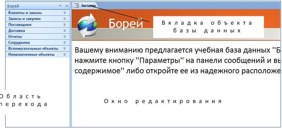 Под лентой расположены слева Область перехода, а справа Окно редактирования, в котором отображается редактируемый объект.