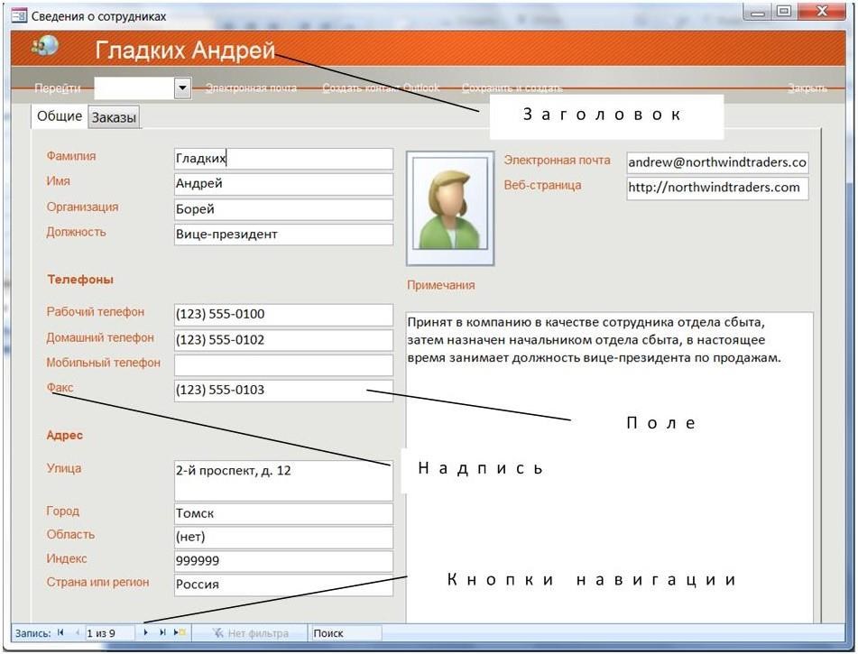Для того, чтобы открыть форму, следует в Области перехода сделать два щелчка на названии формы. Открывается форма, выводящая каждую запись таблицы «Сотрудники» на отдельной экранной карточке.