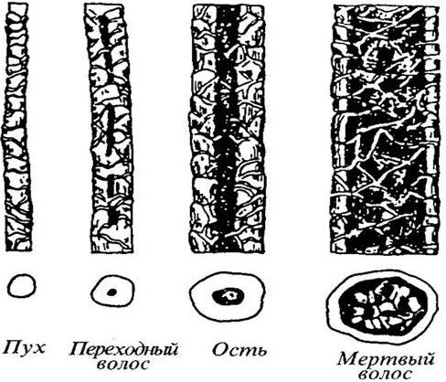 В зависимости от толщины и строения различают следующие основные типы волокон шерсти: пух, переходный волос, ость, мертвый волос (рисунок 6).