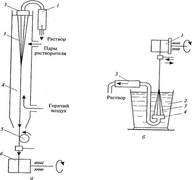 а – сухим способом: 1 – фильтр; 2 – фильера; 3 – нити; 4 – обдувочная шахта; 5 – замасливающий ролик; 6 – приемная бобина; б – мокрым способом: 1 – приемная бобина; 2 – коагуляционная ванна; 3 – нити; 4 – фильера; 5 – фильтр