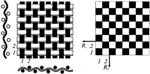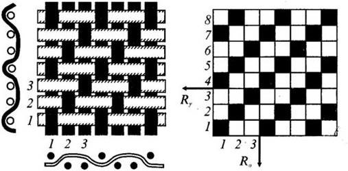 Ткацкие переплетения образуются пересечением взаимно перпендикулярных систем нитей: основных и уточных. Ткани могут быть образованы из двух, трех или нескольких систем нитей (рисунок 20).