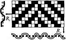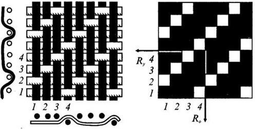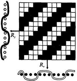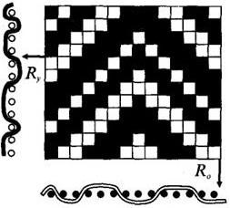 Рубчиковые переплетения создают на ткани выпуклые рубчики, идущие вертикально или наклонно. В каждом раппорте получается два рубчика. Таким переплетением вырабатывается шелковая ткань типа пике (ложное пике, рисунок 39) [1, c 69-85].