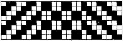 Креповые переплетения можно получить произвольным удлинением перекрытий простого переплетения (рисунок 35) или наложением двух простых переплетений (рисунок 36). Применяются креповые переплетения для выработки разнообразных платьевых крепов и в сочетании с другими переплетениями – для выработки платьевых и костюмных тканей.