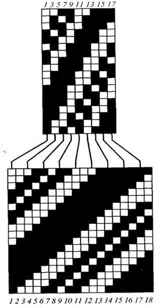 Рисунок 38 – Диагоналевое переплетение, полученное исключением четных основных нитей из сложной саржи