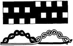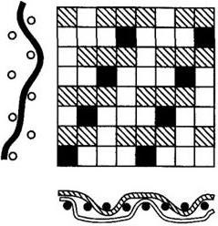 Переплетение « пике» (рисунок 43) состоит из трех систем нитей: на лицевой поверхности ткани две системы образуют полотняное переплетение, третья стягивает его, создавая выпуклые узоры. У хлопчатобумажных пике обычно выпуклый продольный рубчик, иногда выпуклые орнаменты. Переплетением пике вырабатывают ткани для детских изделий, покрывал и др.