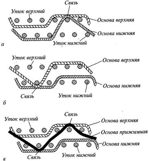 а – нижняя основа под верхним утком; б – верхняя основа под нижним утком; в – связь полотен с помощью прижимной основы