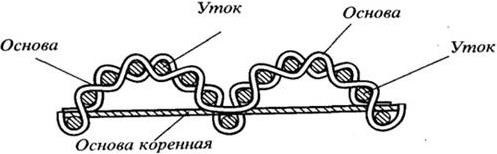Ворсовое переплетение (рисунок 44) образуется из трех систем нитей: одна система ворсовая, образующая на лицевой поверхности разрезной вертикально стоящий ворс, и две коренные – основа и уток. Переплетение коренных систем полотняное или саржевое. Благодаря высокой плотности коренные системы хорошо удерживают ворс.