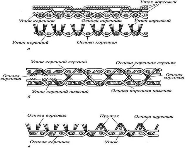 а – уточноворсовое переплетение до и после разрезания уточных нитей; б – основоворсовое переплетение, полученное по двухполотновомуспособу; в – основоворсовое переплетение, полученное по прутковому способу, до и после разрезания ворса