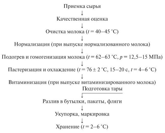 Для предотвращения отстоя жира и образования в упаковках «сливочной пробки¬ при производстве молока с повышенной массовой долей жира (3,5–9 %) нормализованное молоко обязательно гомогенизируют при t = 62–63 °C и давлении 12,5–15 МПа. Затем молоко пастеризуют при t = 76 ± 2 °C с выдержкой 15–20 с и охлаждают до t = 4–6 °C с использованием пластинчатых пастеризационно-охладительных установок. Температура пастеризации постоянно фиксируется самопишущими термографами и регулируется автоматически. Система блокировки исключает выход из аппарата недопастеризованного молока. Эффективность пастеризации в таких установках достигает 99,98 %. Затем молоко при t = 4–6 °C поступает в промежуточную емкость, из которой направляется на фасование. Хранить пастеризованное молоко до розлива не рекомендуется. Поэтому производительности установок для тепловой обработки молока и для его розлива должны быть согласованы. Розлив пастеризованного молока в стеклянные бутылки производится на разливочно-укупорочных автоматах. Применяют два типа машин, дозирующих молоко по объему или уровню. Стеклянные бутылки имеют допуски на внутренний объем, поэтому при заполнении строго определенным объемом молока уровни молока в них оказываются не одинаковыми. Это ухудшает товарный вид партии молока, поэтому чаще применяют дозирование розлива молока в бутылки по уровню. Широко используется для фасования молока тара разового потребления – полиэтиленовые мешки, бумажные пакеты (тетра-пак, брик-пак, пюр-пак). Такая тара значительно легче, компактнее, исключает сложный процесс мойки, гигиеничнее, удобнее для потребителя и транспортирования, требует меньших производственных площадей, трудовых и энергетических затрат. Для розлива пастеризованного молока во фляги применяют аппараты, работающие по принципу объемного дозирования; молоко, заливаемое в цистерны, замеряют по метке или молокосчетчиком. Тару, в которой выпускают с предприятий пастеризованное молоко, обязательно пломбируют и маркируют. На алюминиевых капсулах тиснением, на пакетах, этикетках и бирках для фляг и цистерн несмывающейся краской наносят маркировку: наименование предприятия, полное наименование продукта, объем в литрах (на пакетах), число или день конечного срока реализации, номер ГОСТа и другую необходимую информацию.