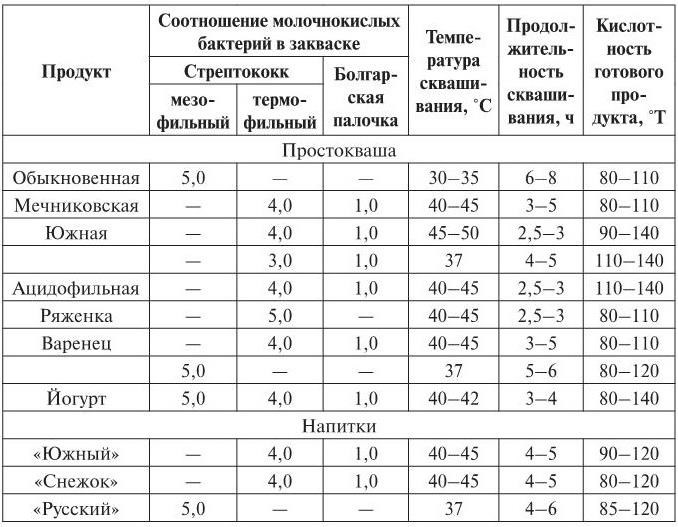 Простокваша известна с давних времен и является наиболее распространенным кисломолочным продуктом. Существует много ее разновидностей, различающихся в основном составом микрофлоры заквасок и режимами сквашивания. В каждой местности выпускают свои национальные виды простокваши: на Украине – ряженка, в Армении – мацун, Грузии-мацони, Туркмении – куранга, в Северо-Восточной Азии – айран, В Татарии – катык и т. д. Также вырабатывается ряд напитков по типу простокваши (табл. 2.7).
