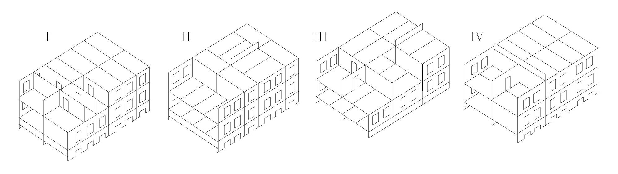 I – перекрестно-стеновая с малым шагом; II – поперечно-стеновая со смешанным шагом; III – поперечно-стеновая с большим шагом; IV – продольностеновая.