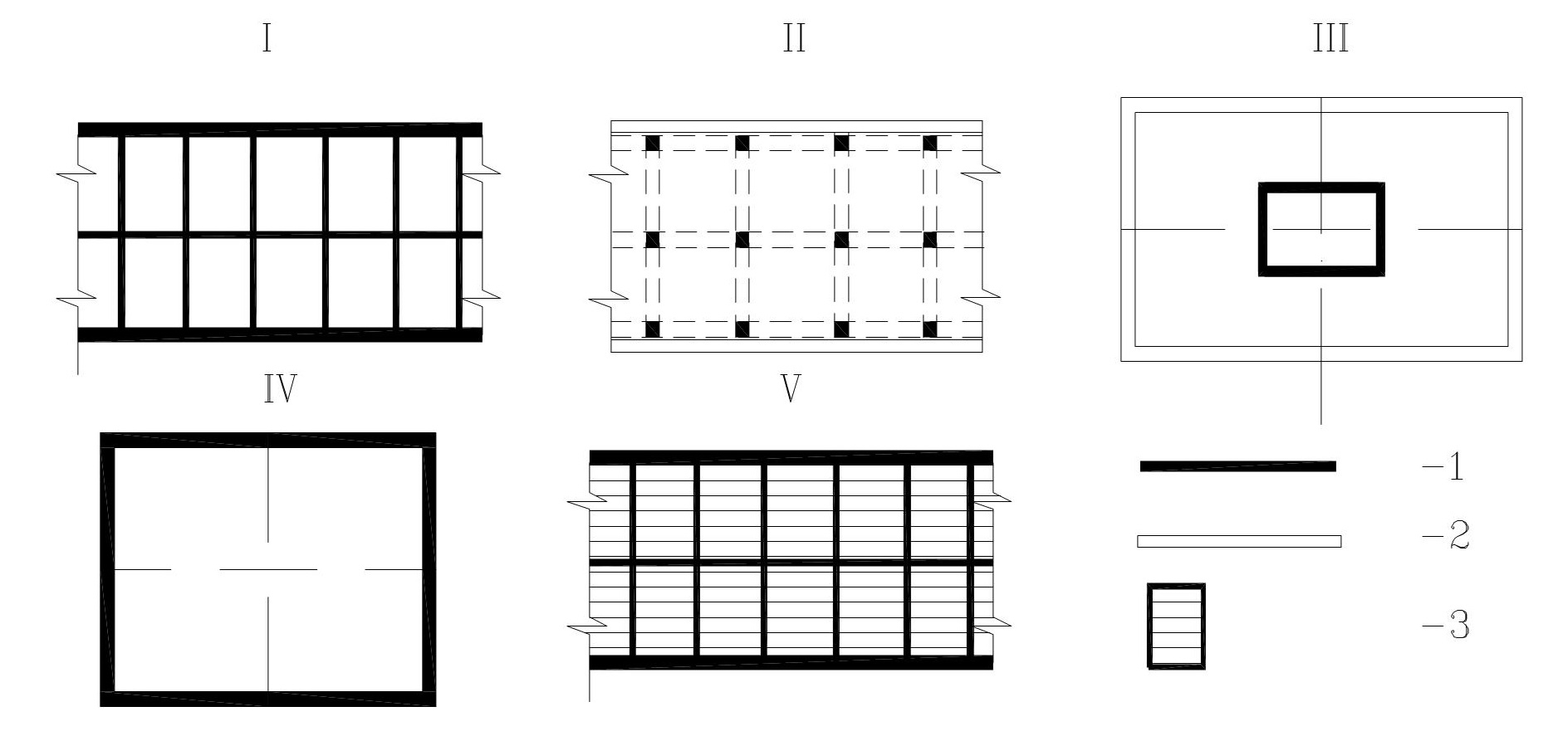 I – стеновая; II – каркасная; III – ствольная; IV – оболочковая; V – объемноблочная; 1 – несущая конструкция; 2 – ненесущая конструкция; 3 – несущий объемный блок.