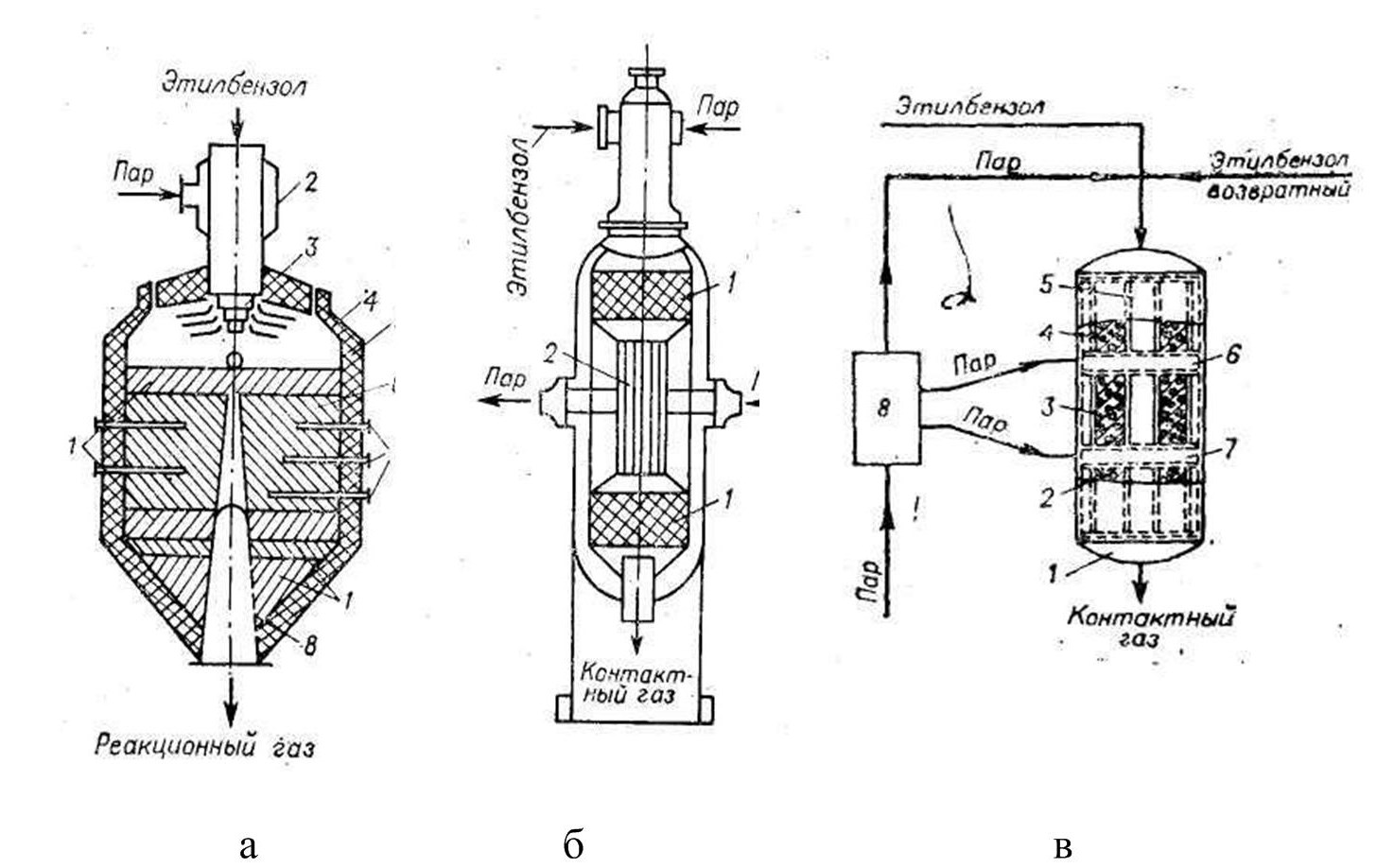 Рисунок 1.1 ? Реакторы дегидрирования ЭБ: а – адиабатический; б – изотермический с промежуточным подогревом реакционной смеси; в – трехсекционный блок адиабатических реакторов с промежуточным подогревом реакционной смеси