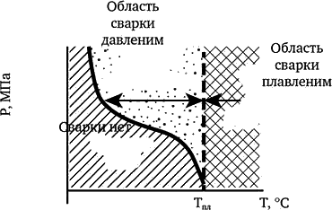 Рис. 1. Схемы возможных областей сварки давлением и плавлением в зависимости от температуры (Т) и давления (Р)