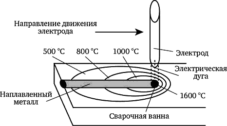Энергия теплового источника (электрической дуги, газового пламени и т. п.) расходуется на нагрев металла детали, на расплавление электрода или присадочного материала, на плавление защитного флюса (покрытия электрода) и на тепловые потери. Распределение температуры в свариваемом металле зависит от мощности источника тепла, физических свойств металла (теплоемкость, температура плавления и др.), размеров конструкции, скорости перемещения и т. д.
